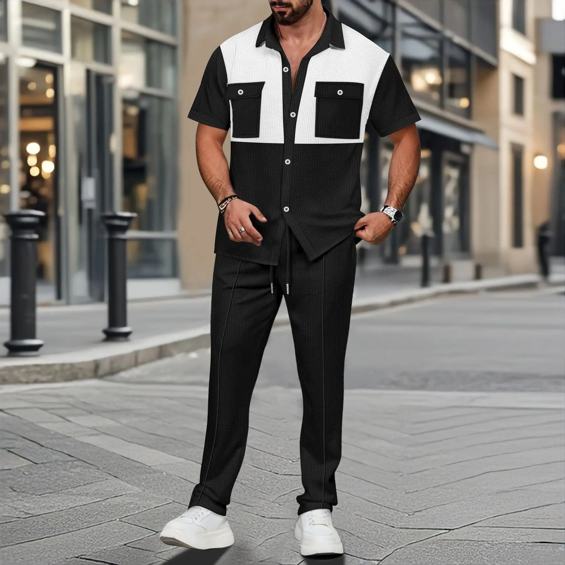 Camicia e pantalone coordinati, con dettagli bianchi a contrasto 🔳, offrono un look curato ma disinvolto, perfetto da mattina a sera. Linee nette, vestibilità comoda e materiali leggeri lo rendono ideale per la stagione calda, ma il suo stile funziona tutto l’anno.