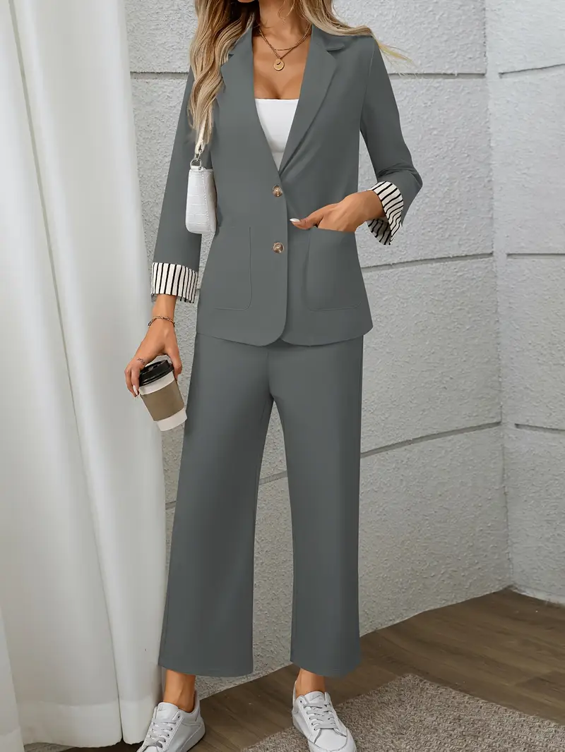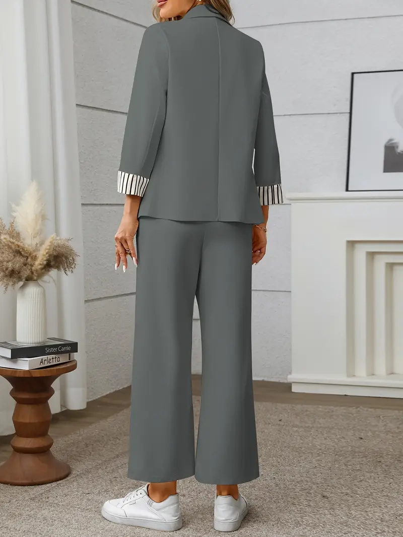 Composto da blazer con risvolti a righe e pantaloni a gamba dritta con coulisse, questo outfit è l’ideale per l’ufficio, un aperitivo informale o una giornata fuori porta.